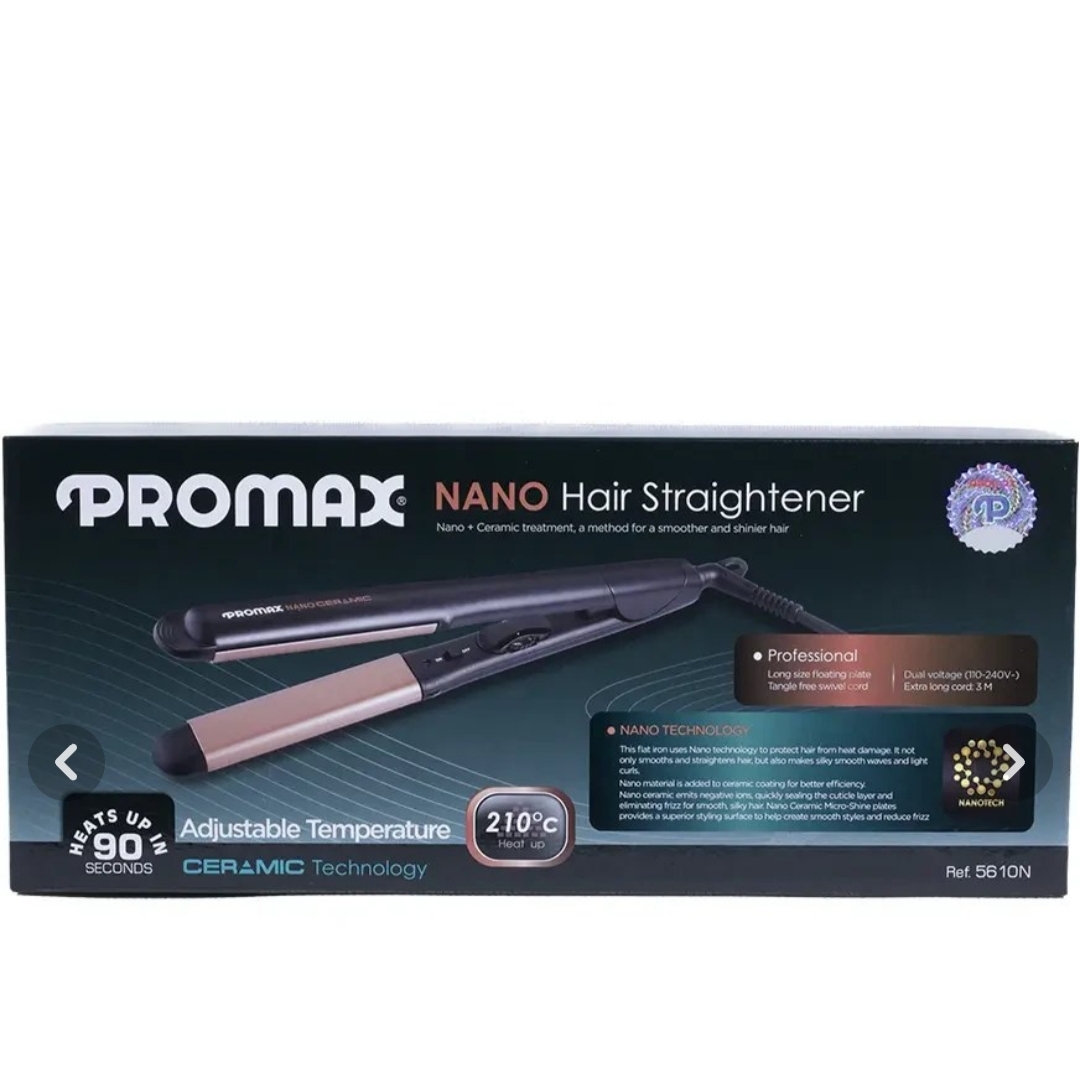 اتو مو نانوسرامیک پرومکس مدل 5610N,دارای درجه حرارت از 150تا 210,پهنای صفحه 28میلی متر ،خاموس شدن خودکار پس از ا ساعت ،دارای نشانگر LED,قدرت دستگاه 58وات ،ایجاد صافی و ابریشم سازی مو ها ,